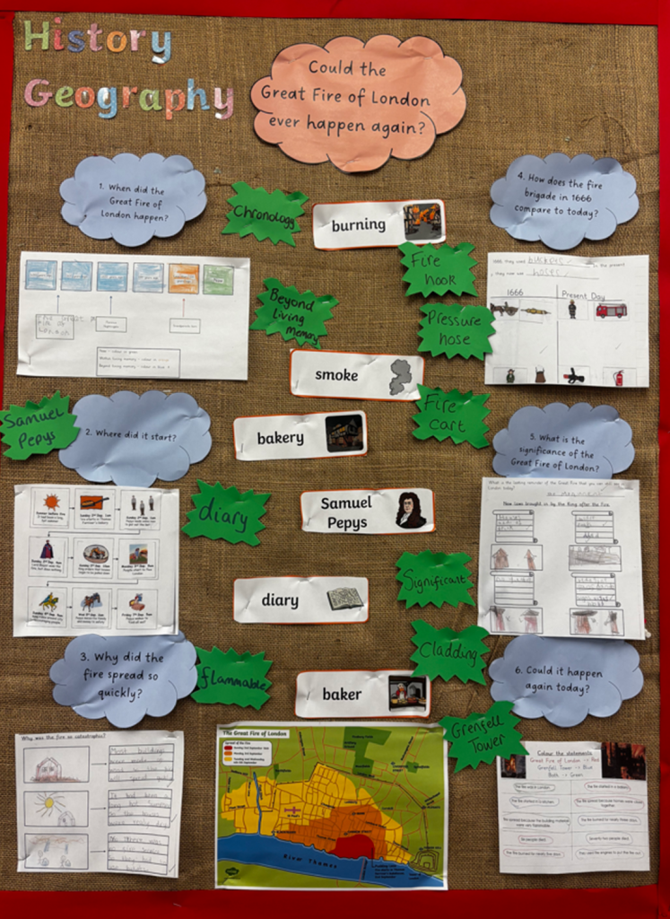 Through the study of significant events such as the Roman Empire, the Great Fire of London, and the Industrial Revolution, pupils explore change and continuity over time. Teaching prioritises clear explanations, vocabulary development, retrieval practice, and the use of historical sources so that pupils can construct informed interpretations and secure knowledge in long-term memory.